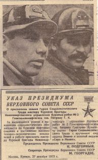 В то время было модным устраивать соревнования между бригадами, соревнуясь с бригадой Петрова. Мои бурильщики писали лозунг «Ну, Петров – ПОГОДИ!!!» - Это был комсомольский задор. Кусты располагались рядом, одновременно забуривали и побеждали бригада Петрова, в следующий раз моя бригада. Приходилось обращаться за советами к Григорию Кузьмичу по техническим вопросам и по работе с людьми, и он давал очень ценные советы».