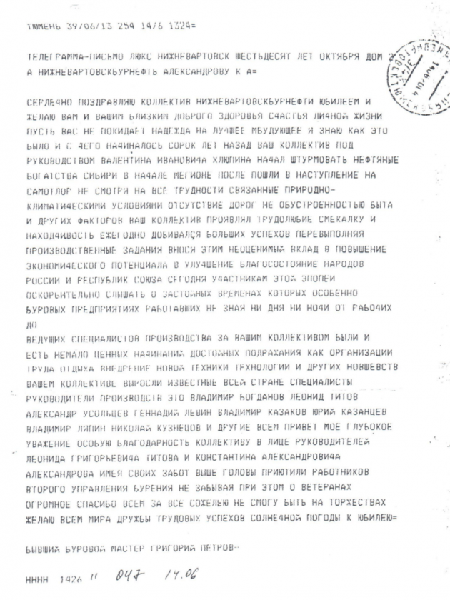 У Рамиля Амировича сохранилась телеграмма-письмо, где Петров, будучи уже на пенсии, поздравил с юбилеем коллектив УБР-2: