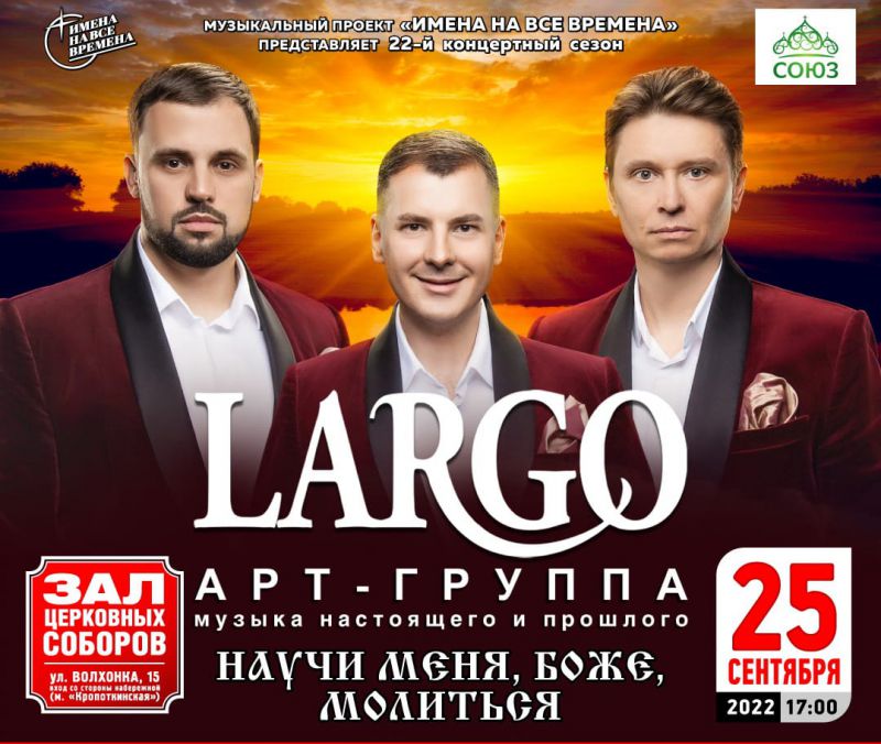 С большим сольным концертом в Москве в Зале Церковных Соборов выступил уникальный российский вокальный коллектив – Арт-группа «LARGO». Артисты исполняют музыку самых разных стилей и направлений (классическая, духовная, народная, эстрадная). Неповторимое сочетание голосов вокального трио способно заворожить даже самого искушённого слушателя. Группа в составе: Владимир Соколов (контр-тенор) Владислав Судаков (лирический тенор) и Александр Порожный(лирический баритон) - стала известной широкой публике благодаря участию в проекте под руководством Олега Газманова, победе в телепроекте “Битва хоров” (телеканал “Россия-1”, 2013), участию в проекте “Наш выход” (телеканал”Россия1″, 2013). Солисты группы известны как обладатели премии “Самые знаменитые люди Краснодара» (2015), лауреаты Всероссийских и Международных конкурсов и фестивалей. Визитной карточкой группы является исполнение духовных песен и псалмов, трогающее самые глубокие струны души. Как отмечали земляки, концерт подарил незабываемые ощущения и эмоции В концертной программе «Научи меня, Боже, молиться» прозвучали известные многим песни: «Слово «мама» дорогое», «Слава Богу за всё», «Запоют акафист соловьи», «Грешный человече», «Вера вечна, вера славна», а также новые песни.