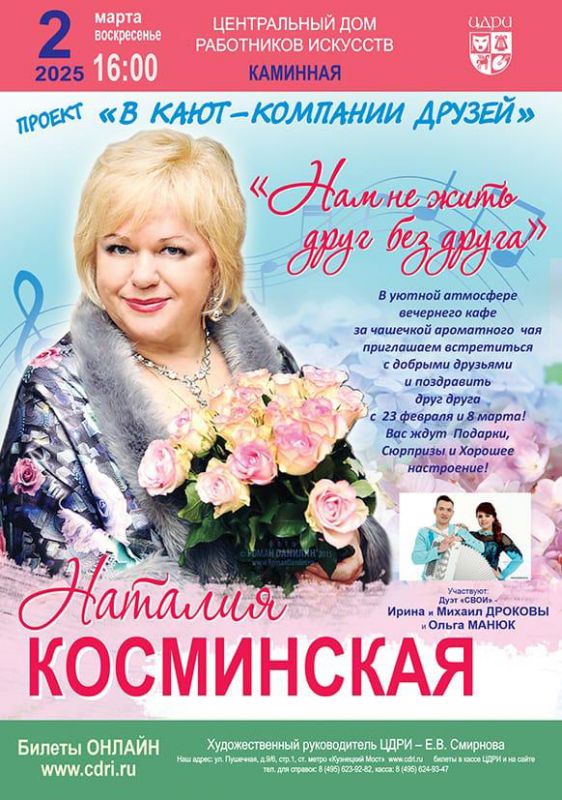 Наталия Косминская приглашает земляков 2 марта провести замечательный вечер в Центральном Доме работников искусств.