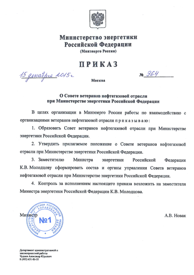 В нашу Общественную редакцию пришел приказ Министра энергетики Российской Федерации А.В.Новака №964 «О Совете ветеранов нефтегазовой отрасли при Министерстве энергетики РФ» от 15 декабря 2015г., вышедший по итогам специальной сессии «Черное золото Западной Сибири: история, традиции и взгляд в будущее». Напомню: сессию с ветеранами нефтегазовой отрасли страны с участием делегации Западно – Сибирского землячества в Москве в рамках Второго Национального нефтегазового форума Александр Новак провел в конце 2014 года.