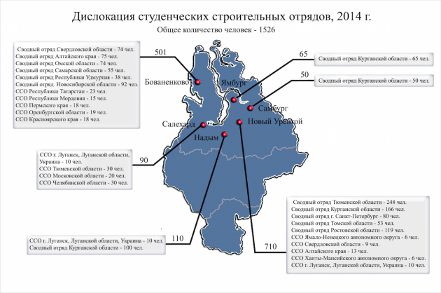 Самбургское месторождение осваивается отрядами из Тюменской и Курганской области, Ямало-Ненецкого автономного округа, Ямбургское месторождение - курганцами. Они же, вместе с ССО из Луганска – трудятся под Надымом. Рядом с Салехардом работают бойцы из Луганска и России: в ОАО «СГК-ТрансстройЯмал» - студенты из Тюменской, Московской и Челябинской областей. В ООО «Уренгоймонтажпромстрой» на территории месторождения Ачимовские залежи бойцы из Тюменской, Томской, Свердловской областей, также Алтайского края. На Юрхаровском нефтегазоконденсатном месторождении работают ребята из Тюменской области и Ханты-Мансийского автономного округа. В Тазовском районе (ООО «Уренгоймонтажпромстрой») трудятся студенты из Томской и Ростовской областей. Вблизи поселка Коротчаево в ОАО «СГК-СтройГарант» - сводный отряд из Ленинградской области.