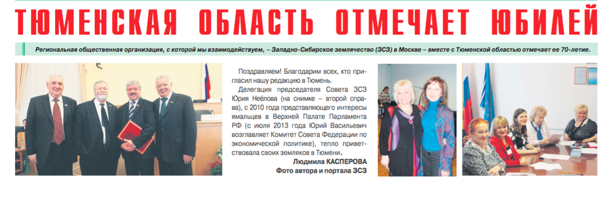 В адрес Западно - Сибирского землячества в Москве поступают поздравления с праздничным юбилеем. На днях в редакцию нашего портала пришла газета «На Западе Москвы. Проспект Вернадского», с которой мы сотрудничаем (спецвыпуск, август 2014г.) Главный редактор издания – член нашей организации Людмила Касперова:
