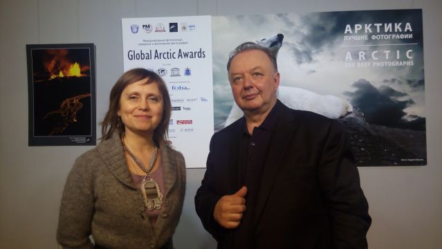 | Главный редактор портала землячества Юлия Коваленко и президент международного конкурса фотографии Global Arctic Awards Сергей Анисимов на открытии выставки |