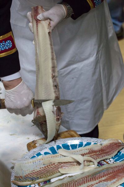 - чукчей и эскимосов - «монтак» (вареная кожа и сало кита) с салатом (А.И.Отке – член Совета Федерации, президент Ассоциации КМН ЧАО, М.Ю.Мемыльнеун, фольклорный ансамбль «Уэлен»);
