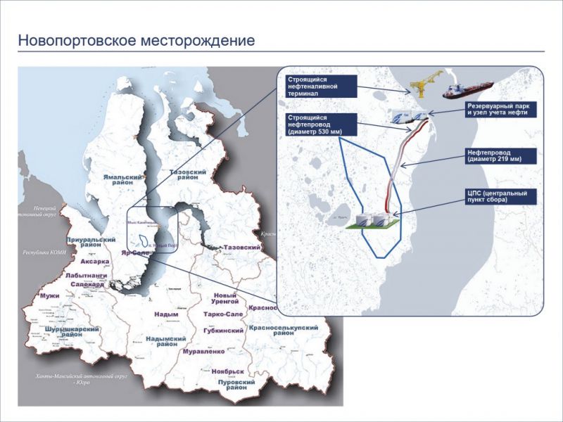 Справка ОАО «Газпром нефть»: В настоящее время электроснабжение проекта осуществляется с помощью газопоршневых и дизельных генераторов. Экономическая эффективность их использования в условиях автономной работы ниже, чем у ГТЭС. Основными сооружениями объекта будут два машинных зала ГТЭС, система газоподготовки, котельная, аварийные дизельные электростанции и силовые трансформаторы мощностью 25 МВА. Новопортовское – одно из самых крупных разрабатываемых нефтегазоконденсатных месторождений полуострова Ямал. Оно расположено за Полярным кругом, вдалеке от транспортной трубопроводной инфраструктуры. В качестве оптимального решения для транспортировки сырья была выбрана отгрузка морем через Мыс Каменный. В настоящее время нефть с месторождения до побережья доставляется по напорному нефтепроводу протяженностью около 100 км и мощностью 600 тыс. тонн в год. В январе компания приступила к строительству второй очереди нефтепровода, который в перспективе обеспечит транспортировку не менее 5,5 млн тонн нефти в год. После увеличения мощности трубопровода и завершения строительства нефтеналивного терминала транспортировка новопортовской нефти будет производиться морским путем круглогодично. Промышленная эксплуатация месторождения начнется в 2016 году.