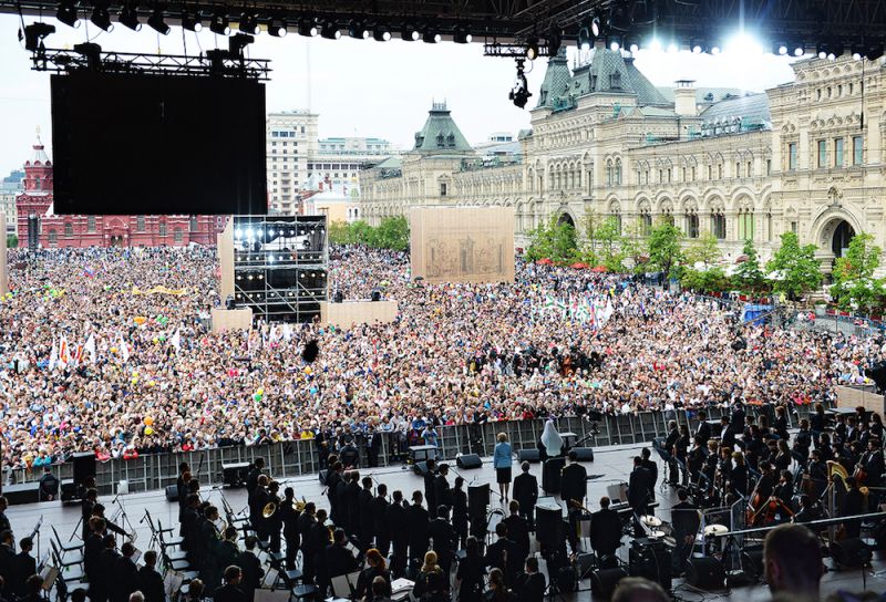 В праздничном концерте выступят 35 детских и молодежных академических хоровых коллективов. Участниками программы станут: Большой детский хор имени В.С.Попова Российской государственной радиокомпании «Голос России», Академический Большой хор «Мастера хорового пения» Российского государственного музыкального телерадиоцентра, Государственная академическая хоровая капелла имени А.А.Юрлова, Государственный академический русский хор имени А.В.Свешникова, Московский Синодальный хор, Хор Сретенского монастыря, Государственная академическая симфоническая капелла России, а также солисты Большого Театра. Торжественный концерт завершится величественным патриотическим гимном «Славься» на музыку М.Глинки из оперы «Иван Сусанин».