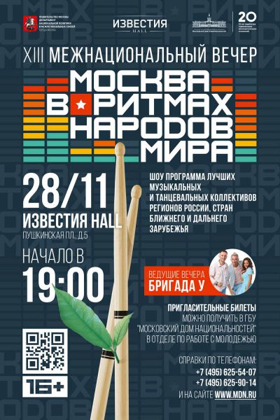 28 ноября 2017 года, во вторник, в 19.00 в клубе «Известия Холл» (Пушкинская площадь, д. 5) состоится XIII Межнациональный вечер «Москва в ритмах народов мира», который станет точкой отсчета 20-летнего юбилейного праздничного года Московского дома национальностей. Красочный старт будет необычным сюрпризом для гостей.