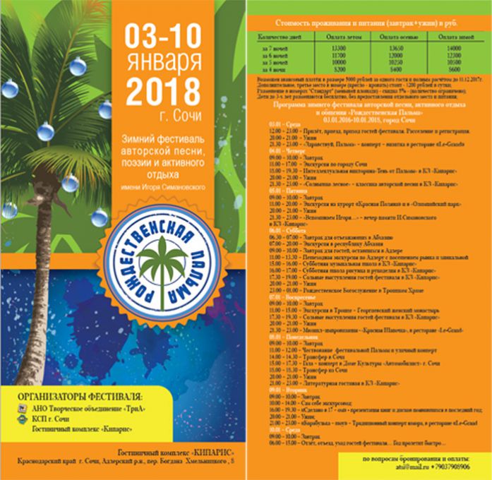 К участию в зимнем фестивале «Рождественская Пальма» приглашают самодеятельных авторов, композиторов, исполнителей, ансамбли, поэтов и слушателей, изъявивших желание совместного организованного времяпровождения в компании друзей Игоря Симановского, десятков прекрасных поэтов и бардов, знающих его творчество. Для членов нашей организации сохраняются летние цены на путевки: atsi@mail.ru. Справки по тел.: +7 (903) 790-89-06, +7 (963) 160-45-10 (Александр Цилькер).